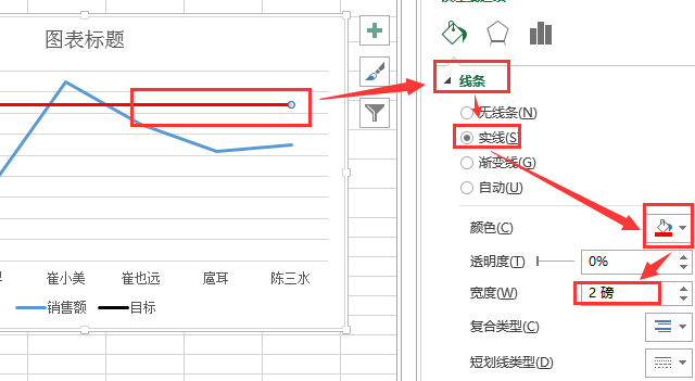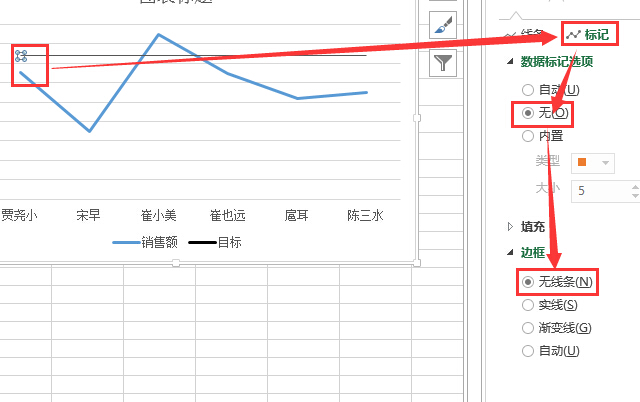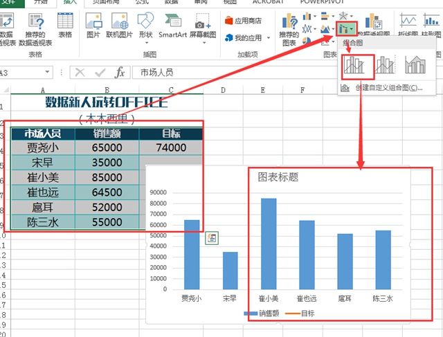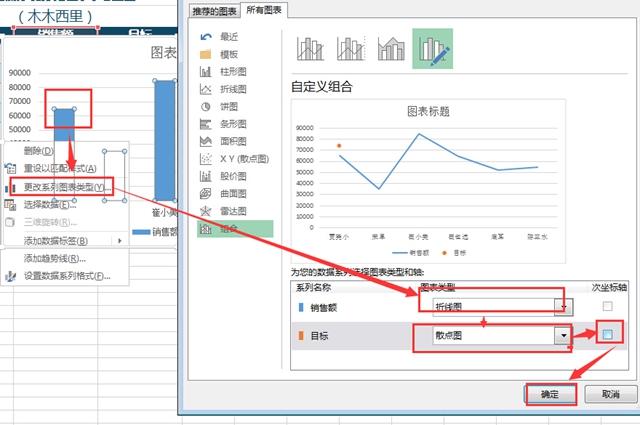 3.更改图表类型。选择图表右击,选择“更改西里图表类型”,销售额改成折线图(用柱状图也没问题,只是为了方便演示)、目标改成“散点图”(必须是这种类型),另外不要选择次坐标轴(可以自己尝试一下,就知道为什么了),点击确定。