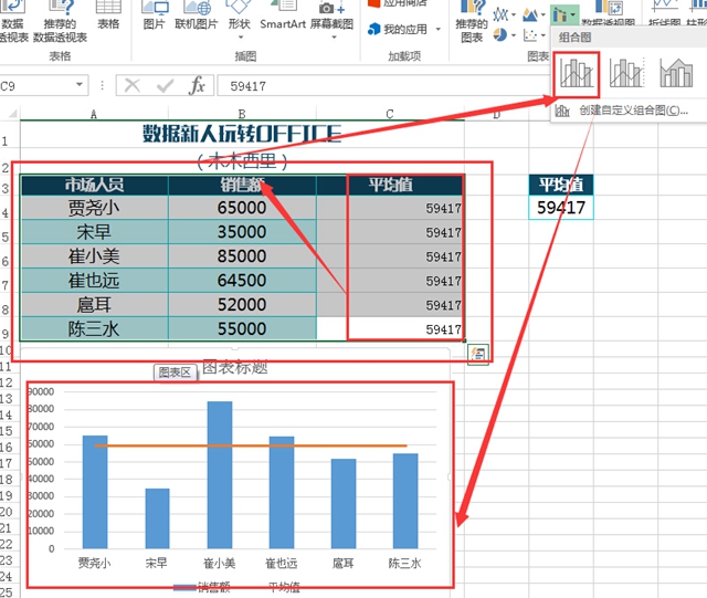 2.选择数据,插入组合图。随便选择一个就可以,后面还要重新选择图表的类型。
