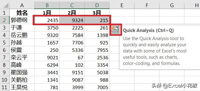 1. 选中 B2 至 D2 单元格,选中区域右下角会出现如下图所示的小图标 --> 点击这个小图标,或者直接按 Ctrl+Q