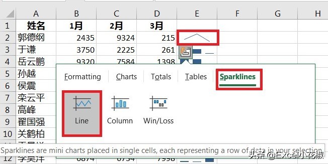 4. 如果要设置折线迷你图,只需要重复步骤 2,在菜单上选择 Line,即折线图