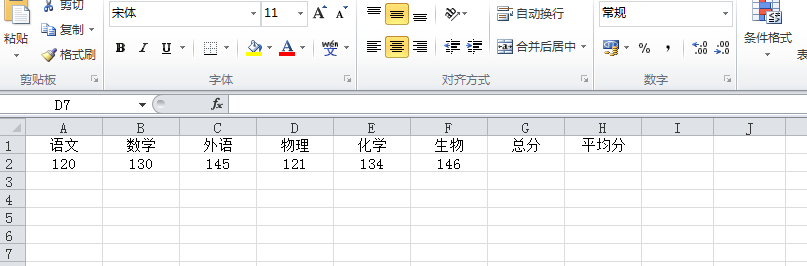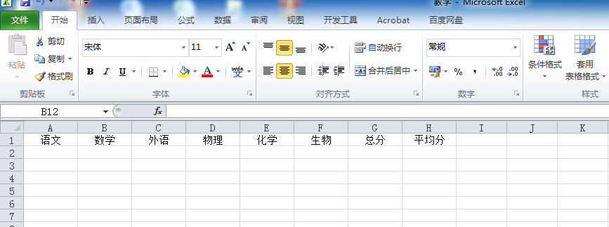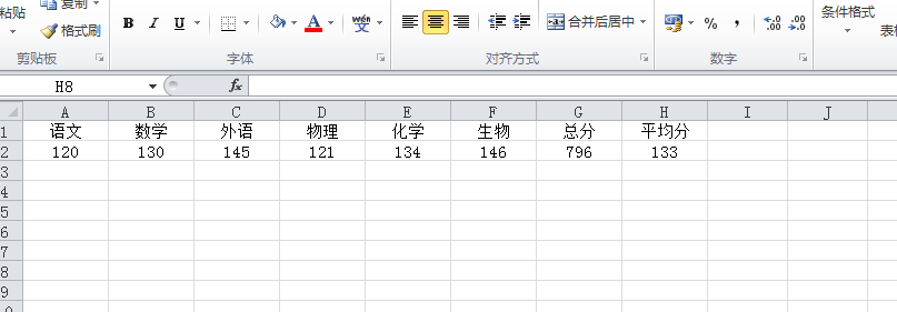 视频加载中...1、打开excel(以excel2010为例),在A1,B1,C1,D1,E1,F1,G1,H1中分别输入语文,数学,外语,物理,化学,生物,总分,平均分