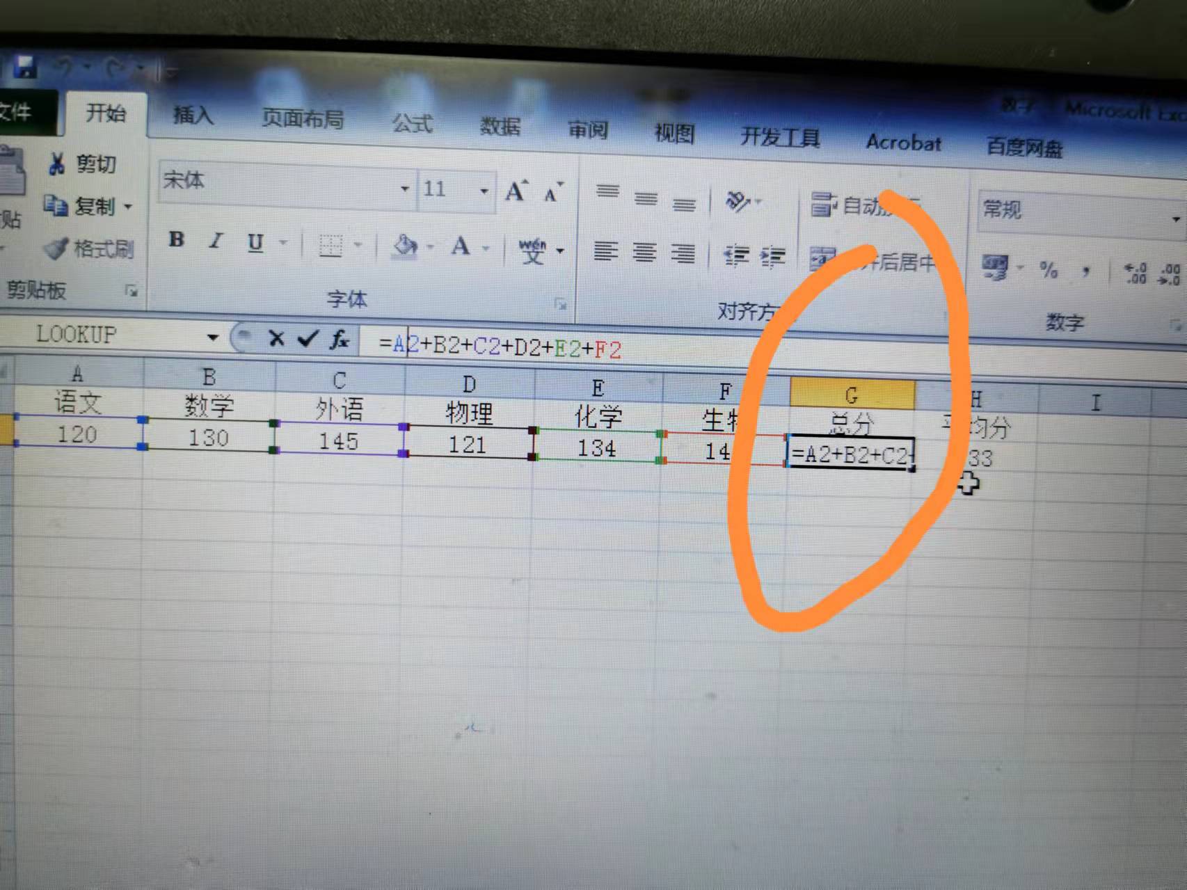 此时,鼠标选中G2,H2,可以很明显的看到,总分是怎么计算的,平均分是怎么计算的(也就是说,是怎么设定计算公式的);同时,各科分数可以随便更改。