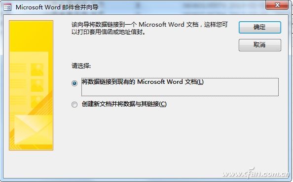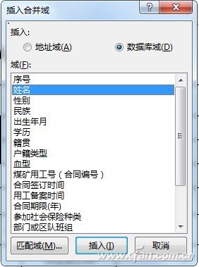 再接下来是合并数据。选择“外部数据→Word合并”,这时弹出一个“Word邮件合并向导”对话框(图6)。选择“将数据链接到现有的Microsoft Word 文档”,单击“确定”按钮。在“年检”文件夹中选择已经建成的文档“从业人员年检申报审核表”Word文档并打开。将光标放在需要填入姓名的位置,选择“邮件”中的“插入合并域”按钮,选择“姓名”字段,单击“插入”按钮,然后点击“关闭”(图7),这样就插入了一项内容。用同样的方法将其他的内容依次填入表中(图8)。
