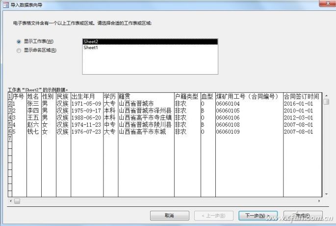 接下来导入数据。点击“外部数据→导入Excel电子表格”,打开“选择数据源和目标”对话框,在指定对象定义的来源点击“浏览”找到“年检”文件夹,选中刚才建成的“年检申报表”Excel表, 点“打开”按钮。选中“将数据源导入当前数据库的新表中”然后确定,进入“导入数据表向导”。选择Sheet2表,点击“下一步” (图4)。
