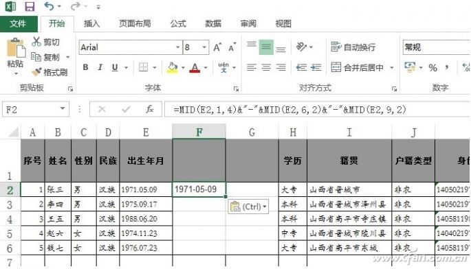 为了方便下面的工作,将这张表复制一份到Sheet2中,并去掉表头。建议以部门排序,方便以后整理。由于年检申报表打印出来的的日期格式是YYYY-MM-DD,而从年检软件导出的格式是YYYY.MM.DD,需要更改一下格式。以出生年月为例,在Excle表格中出生年月后插入两F、G列,将“=MID(E2,1,4)&"-"&MID(E2,6,2)&"-"&MID(E2,9,2)”输入到F2中,然后双击F2右下角,这样全列就填好了(图2)。