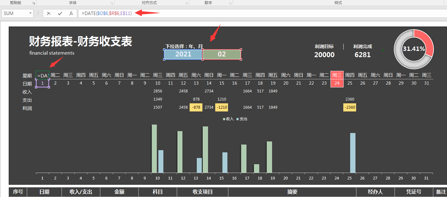 メ大家请看范例图片,Excel单页式收支统计表,上面为数据统计图表区域,下方为日常记录区域。メ