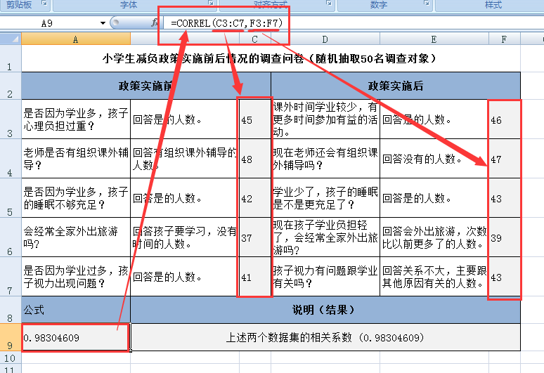 返回单元格区域 array1 和 array2 之间的相关系数。使用相关系数可以确定两种属性之间的关系。例如,为了解小学生减负政策的影响,我们随机抽取50名调查对象,将政策实施前与实施后情况进行对比。