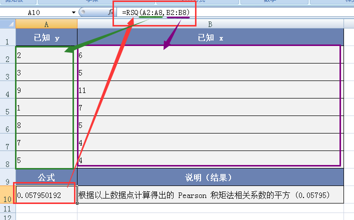 返回根据 参数known_y's 和 known_x's 中的数据点计算得出的 Pearson 乘积矩相关系数的平方。