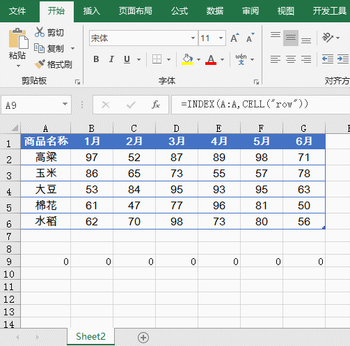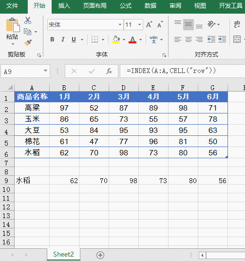 INDEX函数再根据活动单元格行号,返回A列中对应行的内容。