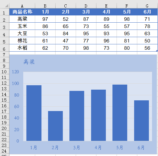 光标在不同行中单击时,图表能够自动显示该行商品的6个月销量变化情况。