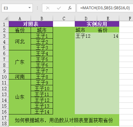 - 构建好EXCEL的思路,我们首先在E3单元格输入公式=MATCH(D3,$B$1:$B$16,0),我们可以看到,获取的结果是14,这个match函数,就是查找D3在对照表中的位置