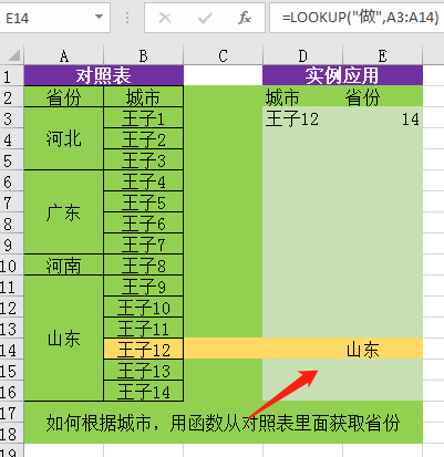 - 这次我们在E14单元格,输入公式=lookup("做",A1:A14),确定后,我们可以看到,可以得到省份,山东