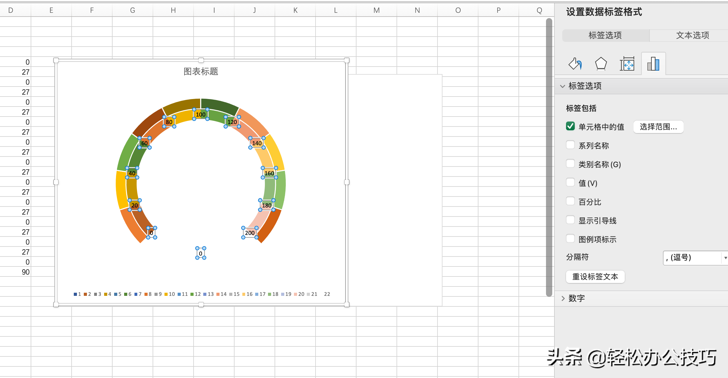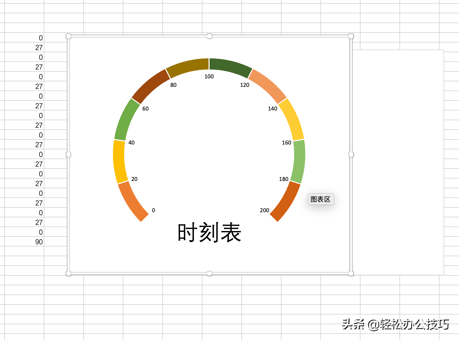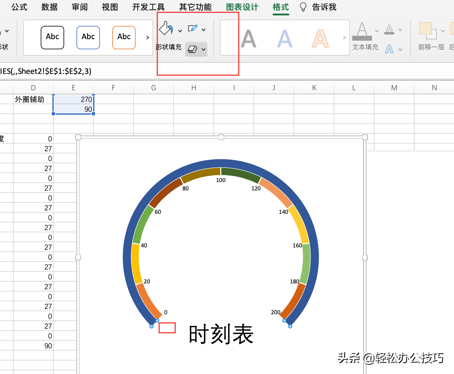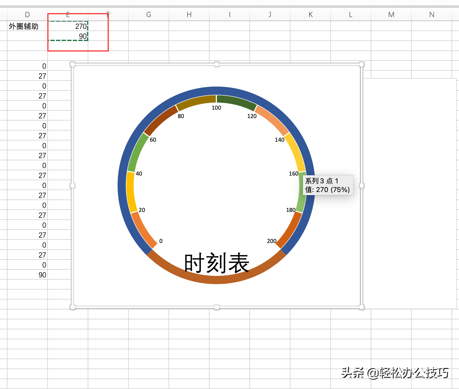 首先建立辅助列,将设置仪表盘空白位置角度为90度。