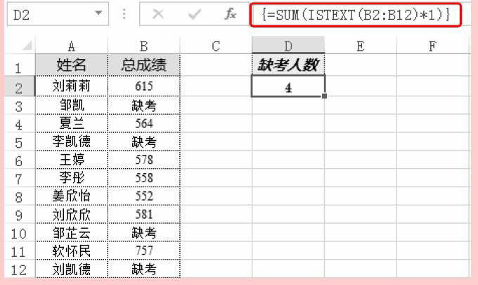 本例表格统计了学生的总成绩,并对缺考的学生进行了缺考标记,要求统计出缺考人数的合计值。