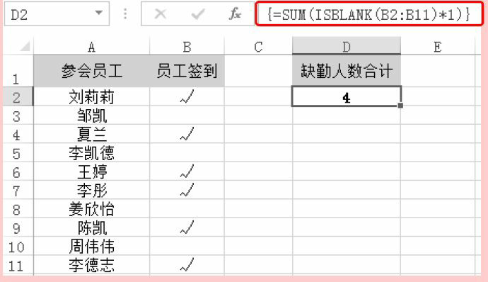 利用SUM函数和ISBLANK函数,可以根据已知的员工签到标记统计出缺勤总人数。