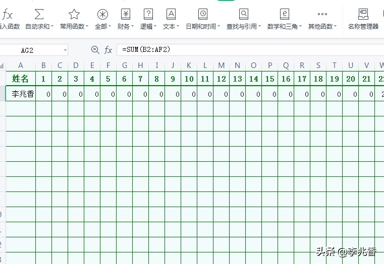 在AG2单元格输入公式“=SUM(B2:AF2)”,公式的意思是求从1号至31号的工资总和。
