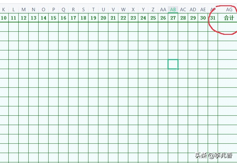 在31后面,再新增一列,命名为“合计”,用来统计每人的工资总额。