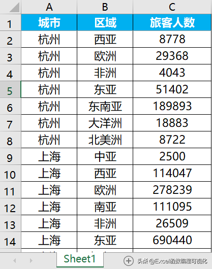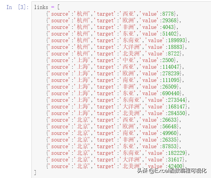 下图中为准备好的数据源,每一行为城市对照区域以及相应的旅客人数。