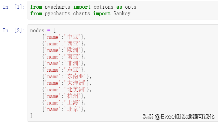 其次输入桑基图参数nodes,主要格式为{'name':'字段'},表格中A/B列涉及到的所有字段,都要输入进去。