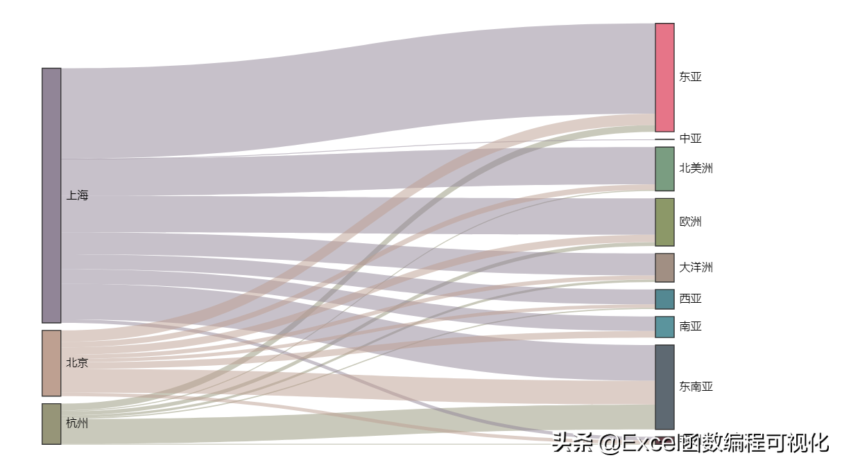 从图形中我们可以看出城市上海通往各区域的人数远远多于北京和杭州市,且在东亚地区具有较大优势,东南亚区域三城市人数相当,中亚、西亚、非洲人数相对较少!