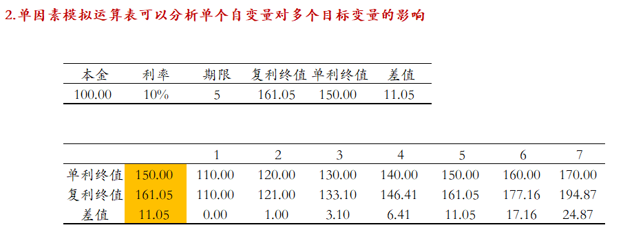 在这个表格中,我们看到在本金是100元,利率是10%,期限是五年的情况下,用复利计算的终值是161.05元,单利计算的终值是150元,两者之间的差值是11.05元。我们都知道,随着年限的增加,复利计算和单利计算的差值应该会越来越大,我们可以用单因素模拟运算表来验证一下这个想法。