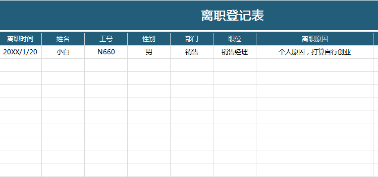 离职登记表:记录离职时间、姓名、工号、性别、部门、职位、离职原因等信息。
