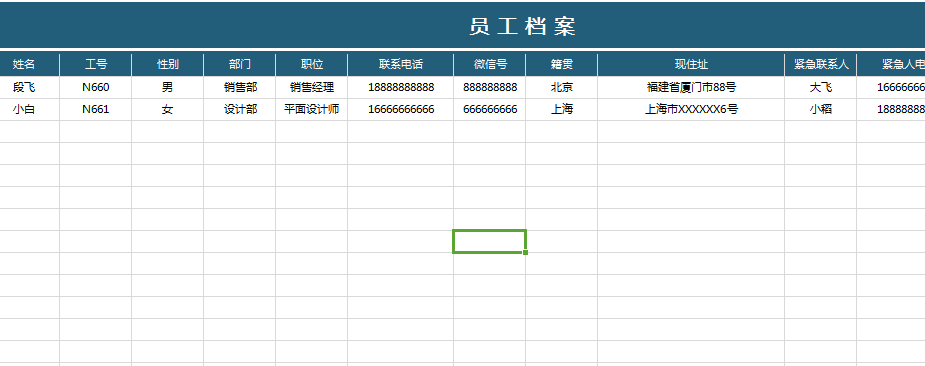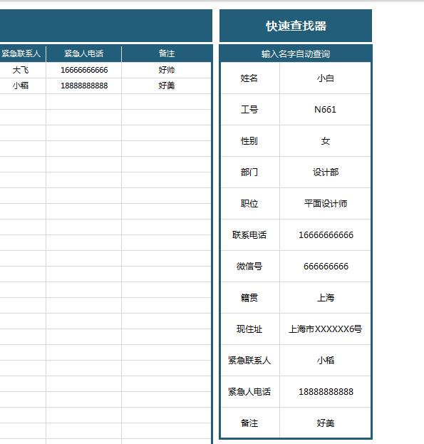 在员工档案工作簿内添加了快速查找器模块,通过录入员工姓名快速查找并单独显示员工详细信息。