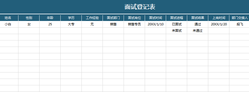 面试登记表:记录姓名、性别、年龄、学历、工作经验、面试部门 、岗位、时间、结果及部门交接人等信息。