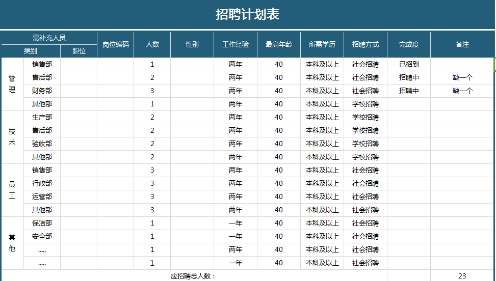 招聘计划表:记录需补充人员、岗位编码、人数、工作经验、年龄、所需学历、 职位等招聘信息。