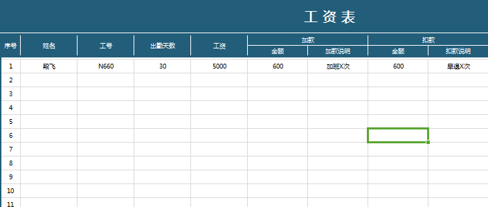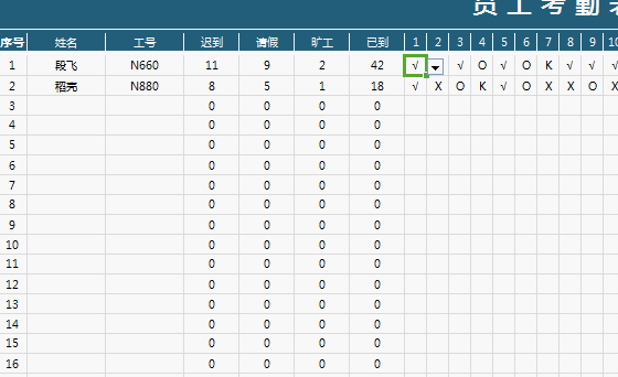 首先介绍一下考勤表,手动录入员工姓名、工号后,在日期栏选择下拉菜单勾选考勤标识符号即可自动统计汇总月出勤信息。