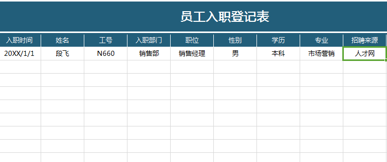 入职登记表:记录入职时间、部门、姓名、职位、学历、专业、招聘来源等信息。