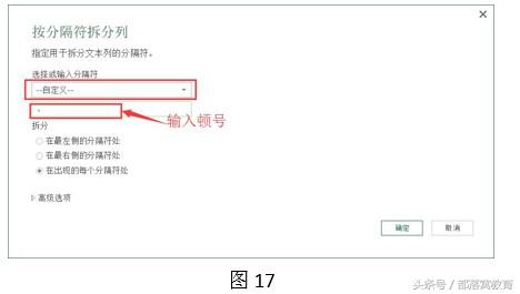 第五步:弹出“按分隔符拆分列”对话框,在下拉列表中选择“自定义”选项,在输入框中输入“顿号”,再单击确定。