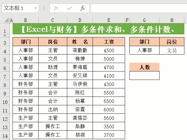 要求:统计人事部文员的人数