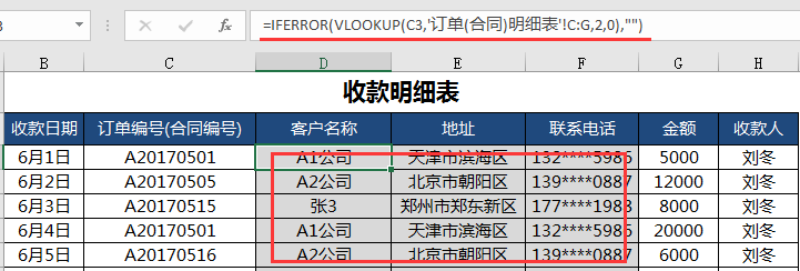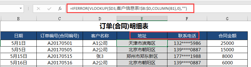 合同明细表中,大家注意地址和联系电话,运用函数自动生成。