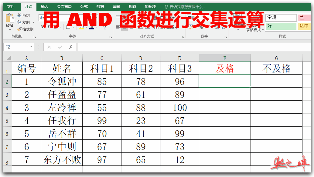 操作:在“及格”栏(单元格F列)输入函数:=AND(C2>60,D2>60,E2>60)。