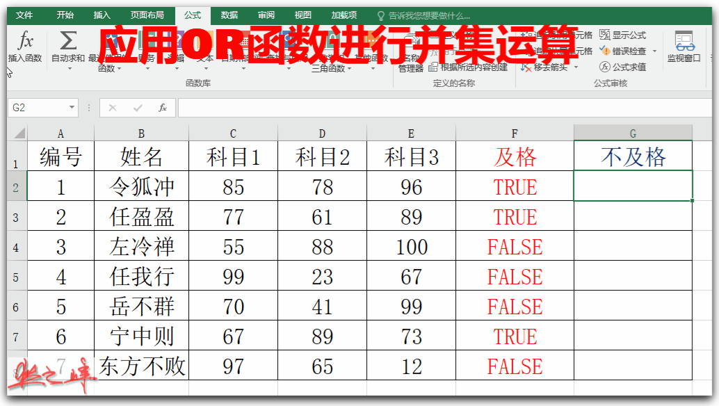操作:在“不及格”栏(单元格G2)输入函数:=OR(C2<60,D2<60,E2<60)。