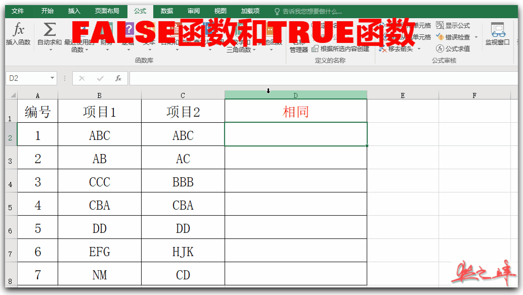 操作:在“相同”栏(单元格D列)输入函数:=B2=C2。