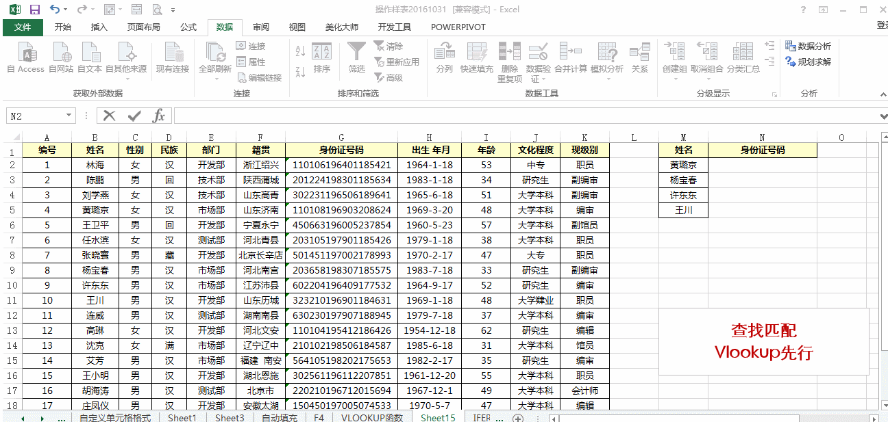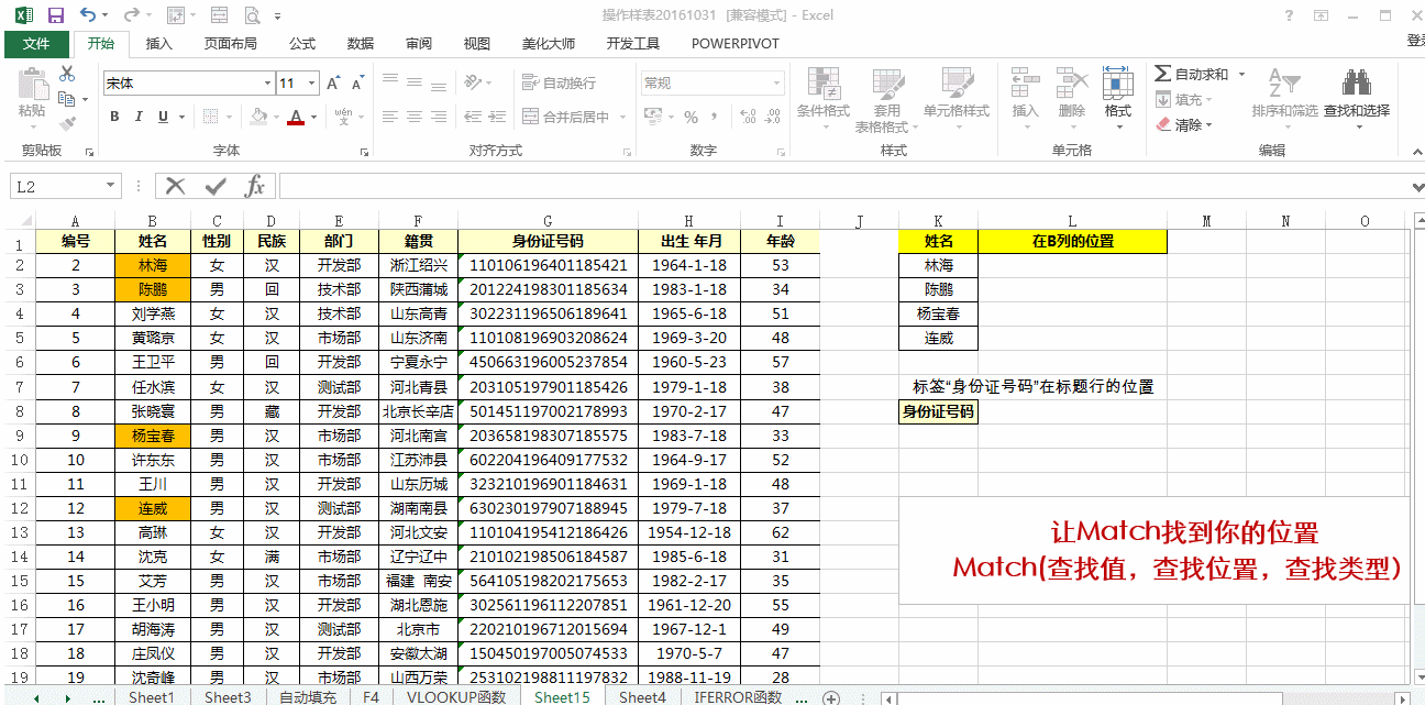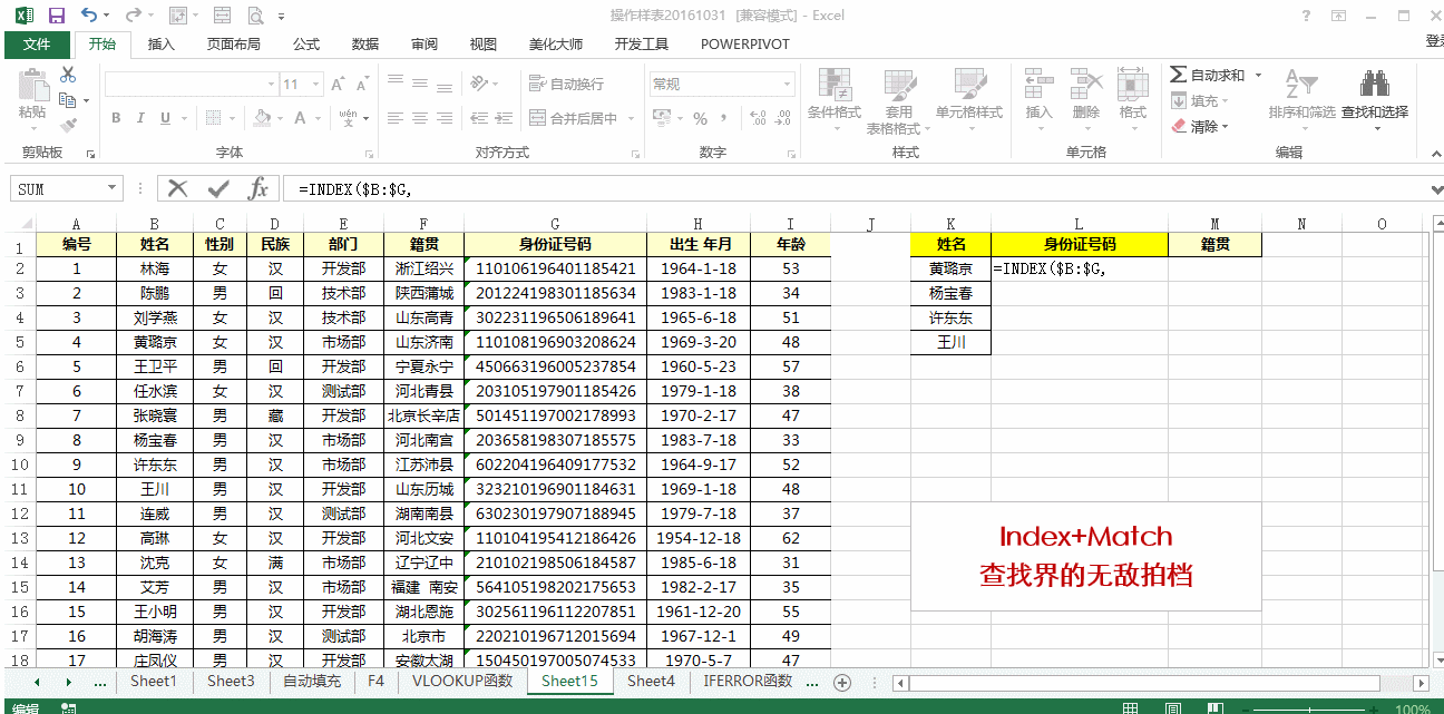Index+Match中,Match用以确定数据所在的行值和列值(查找姓名所在的行,查找身份证号所在的列,行列交汇的数据就是要匹配出来的数据),Index负责调出由Match确定的行值和列值交叉位置确定的唯一数据,于是查找匹配就自然实现了。