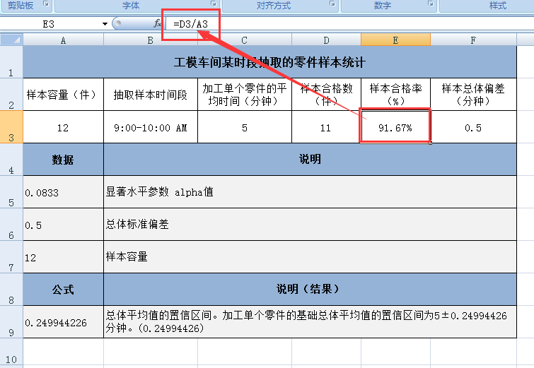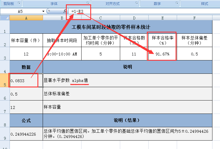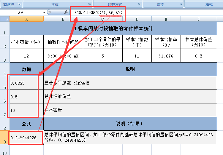 假设样本取自一个工厂的工模车间上午9:00-10:00所加工的零件数12件,加工单个零件的平均时间为 5 分钟,总体标准偏差为 0.5 分钟。alpha =0.0833,计算 CONFIDENCE(0.0833, 0.5, 12) 的返回值为 0.24994426。那么,相应的置信区间为 5 ± 0.24994426 = 大约 [4.7, 5.3]。对于包含在本区间中的任何总体平均值 μ0,从 μ0 到 5,获取样本平均值的概率大于 0.0833。同样地,对于未包含在本区间中的任何总体平均值 μ0,从 μ0 到 5,获取样本平均值的概率小于 0.0833。