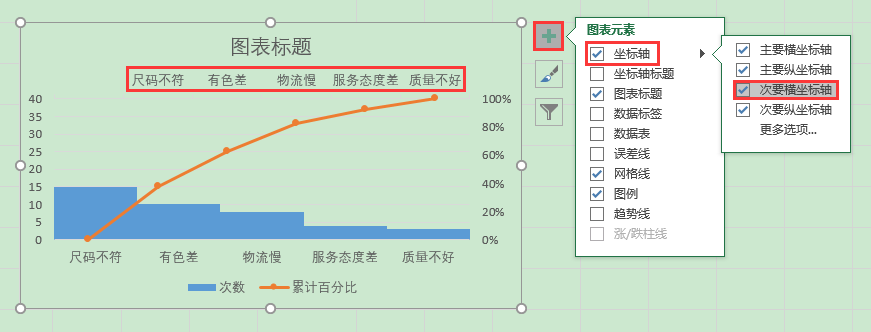 - 鼠标单击图表,在图表右侧出现浮动按钮,点击最上面的"+"按钮,在弹出的[图表元素]列表中勾选[坐标轴]选项,单击[坐标轴]右侧的三角形按钮,在级联菜单中勾选[次要横坐标轴]。此时,在图表标题下方出现了次要横坐标轴。