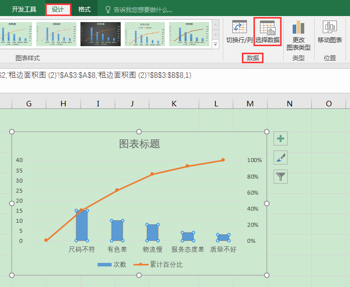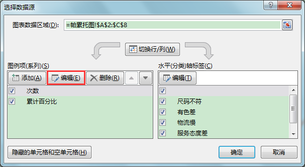 - 单击选中系列"次数",在[设计]选项卡[数据]功能组中单击[选择数据]按钮。在弹出的[选择数据源]对话框中,单击[图例项(系列)]下的[编辑]按钮,弹出[编辑数据系列]对话框。