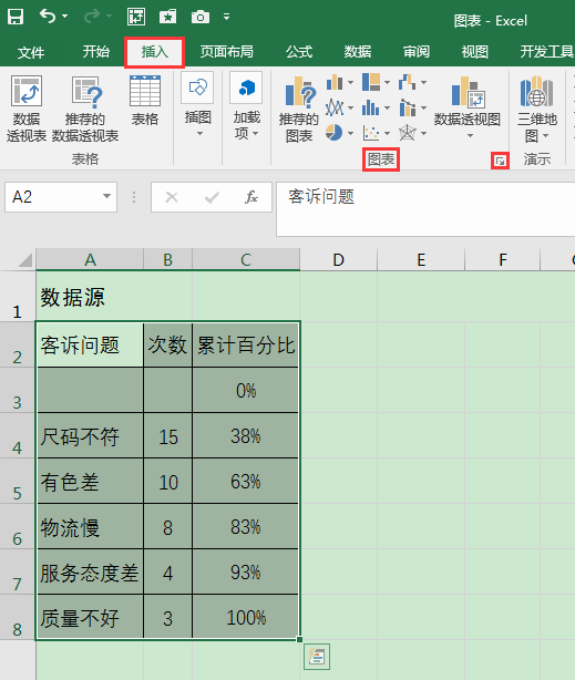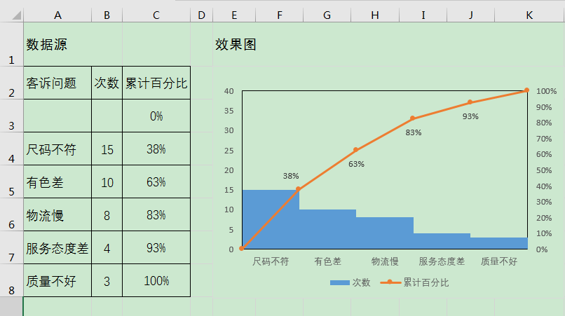 下图左侧A2:C8单元格区域为数据源,A3:C3单元格为辅助行。右侧为根据数据源制作的帕累托图,系列"次数"用柱形图展示,系列"累计百分比"用带数据标记的折线图展示。折线中的每个数据标记均与柱形的垂直边缘线对齐,且前两个数据标记"0%"和"38%"位置分别与第一个柱子左下角和右上角的端点重合。