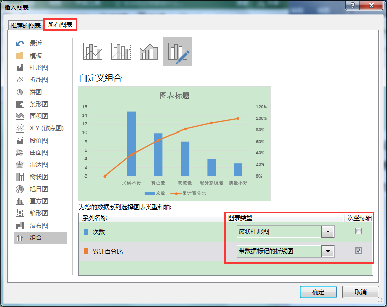 2、在[插入图表]对话框中,切换到[所有图表]选项卡,在左侧列表中选择最下方的[组合],在右侧将系列"次数"的图表类型设为"簇状柱形图";将系列"累计百分比"的图表类型设为"带数据标记的折线图"(同时勾选"次坐标轴"),单击[确定]按钮。