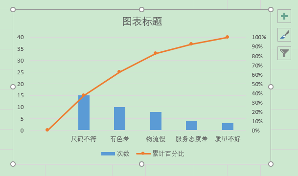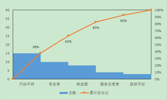 帕累托图由意大利经济学家帕累托发明,由柱形图与折线图组合而成,柱形图中的数据点根据数值大小从高到低排列,折线图反映相应数据点的累计百分比。