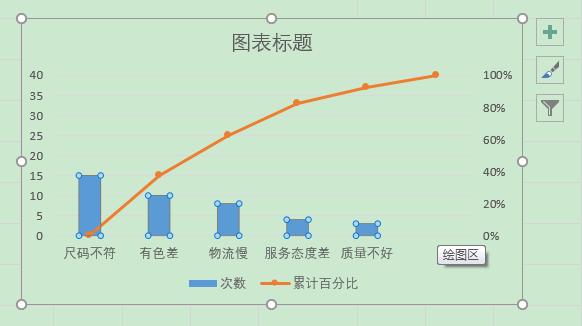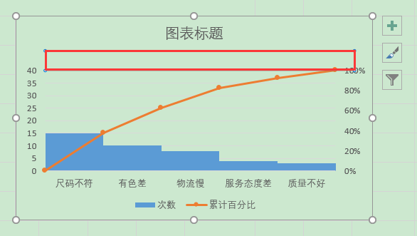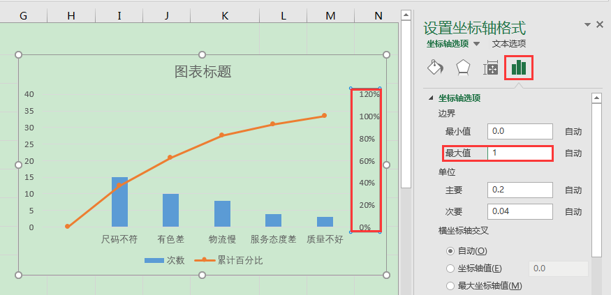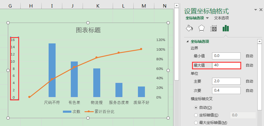 - 双击主要纵坐标轴,在工作表右侧弹出的[设置坐标轴格式]对话框中,在[坐标轴选项]下将[边界]中的[最大值]设为"40"(系列"次数"所有数据点数值之和)。