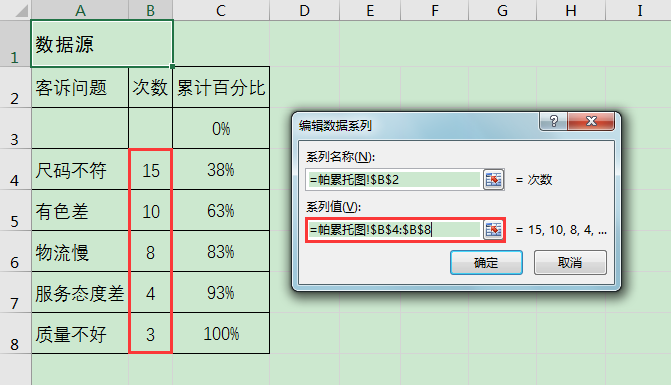 - 在[编辑数据系列]对话框中,将[系列值]编辑框中默认的"=帕累托图!$B$3:$B$8"改为"=帕累托图!$B$4:$B$8",排除B3单元格中的空值。单击[确定]按钮。