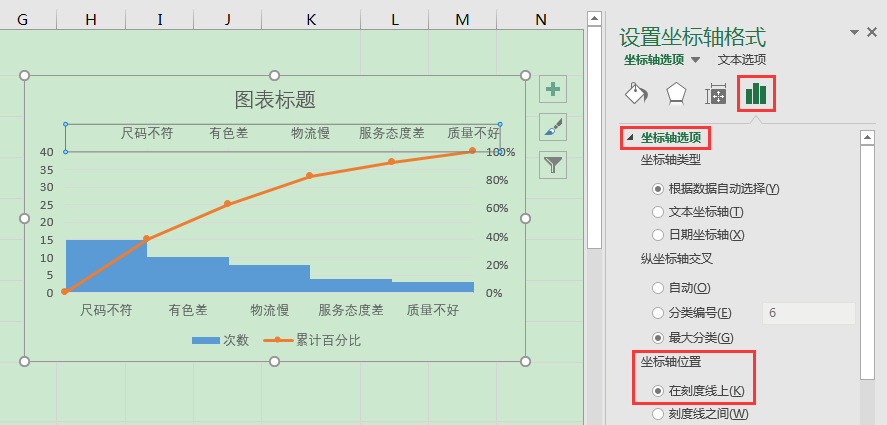 - 鼠标双击次要横坐标轴,在工作表右侧弹出的[设置坐标轴格式]对话框中,将[坐标轴选项]下的[坐标轴位置]设为"在刻度线上"。此时,可见"累计百分比"折线整体向左偏移了半个柱形的宽度,折线的第一个数据标记与系列"次数"第一个柱子左下角的端点重合,其余数据标记均与对应柱子的右边缘对齐。