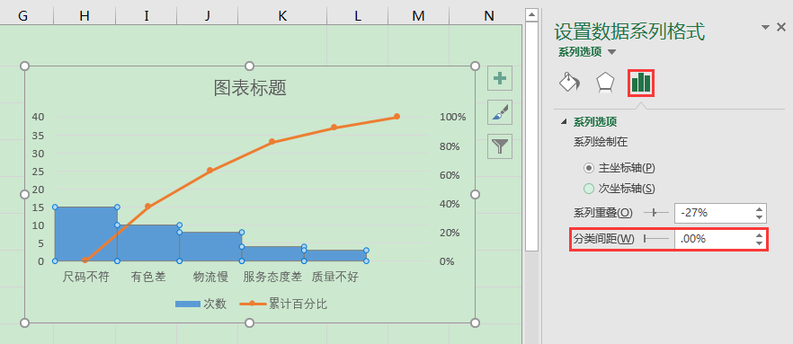 - 双击图表中的系列"次数",在工作表右侧弹出[设置数据系列格式]对话框,在[系列选项]下将[分类间距]设为"0"。此时,所有柱子紧靠在一起,且第一个柱子紧贴纵坐标轴。