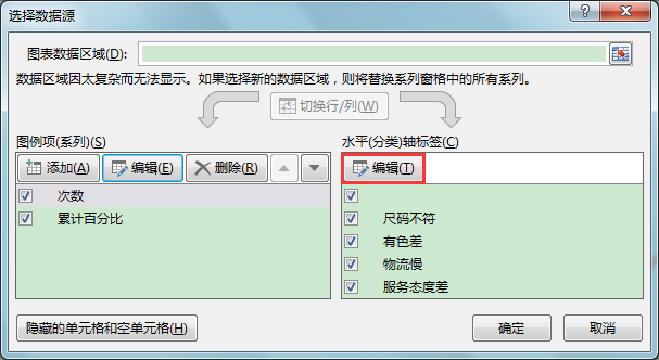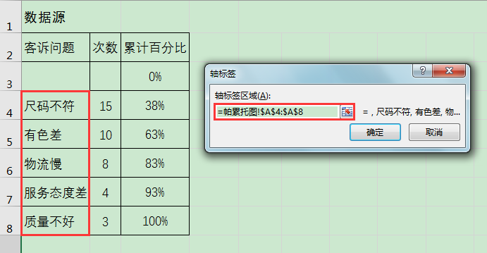 - 返回[选择数据源]对话框,单击[水平(分类)轴标签]下的[编辑]按钮,弹出[轴标签]对话框。在[轴标签]对话框中将[轴标签区域]编辑框中默认的"=帕累托图!$A$3:$A$8"改为"=帕累托图!$A$4:$A$8",排除A3单元格中的空值。单击[确定]按钮。
