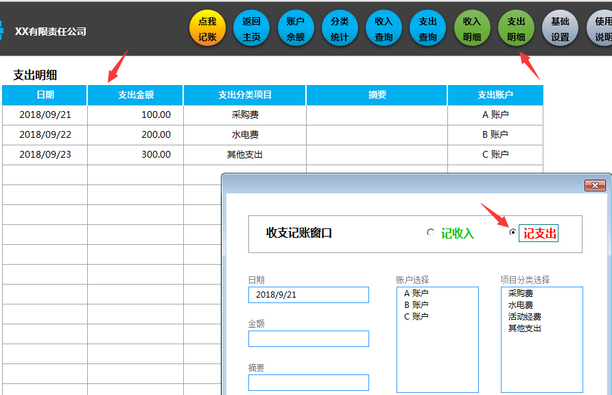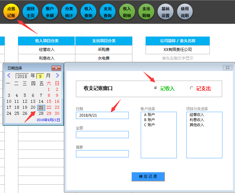 任何工作表状态下,点击记账,弹窗选择收入/支出,点击日期万年历选择,再选择账户,项目,输入金额保存。